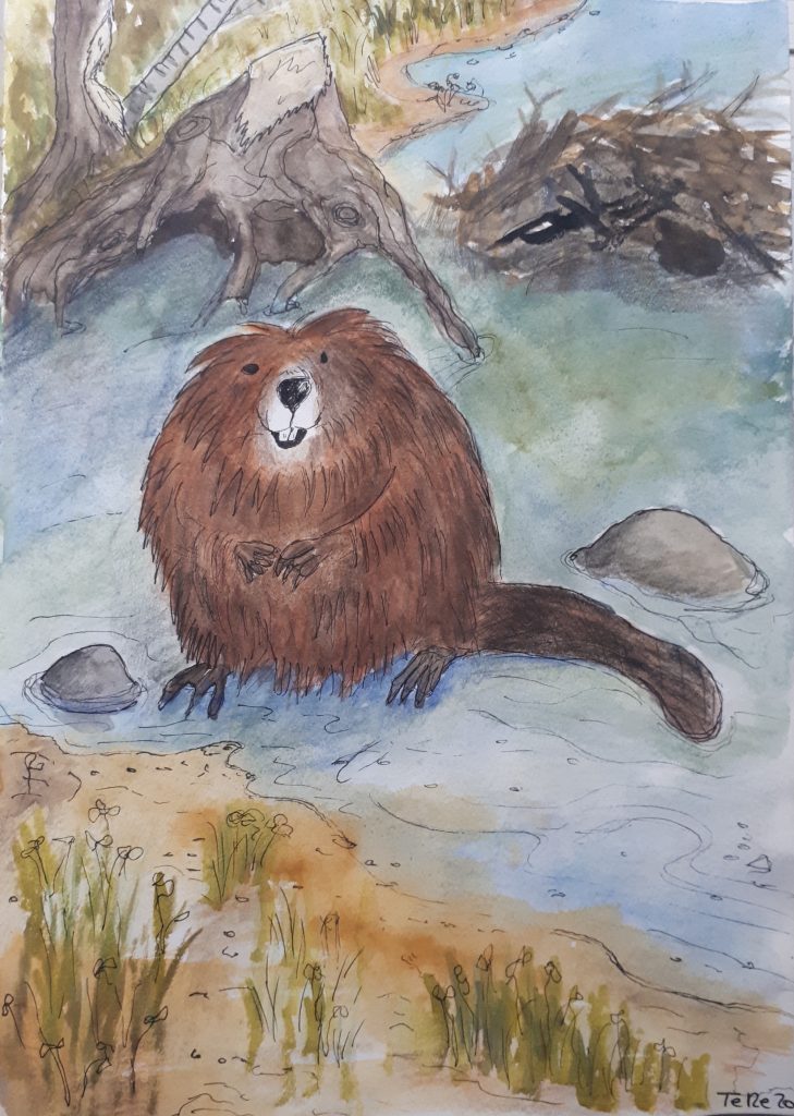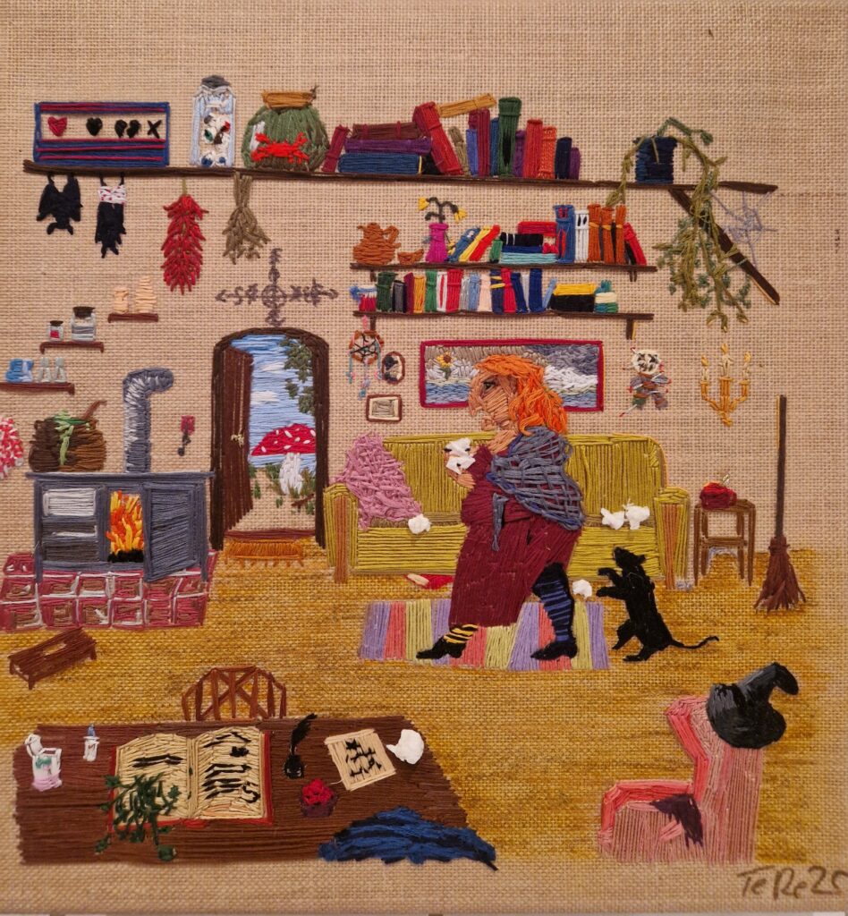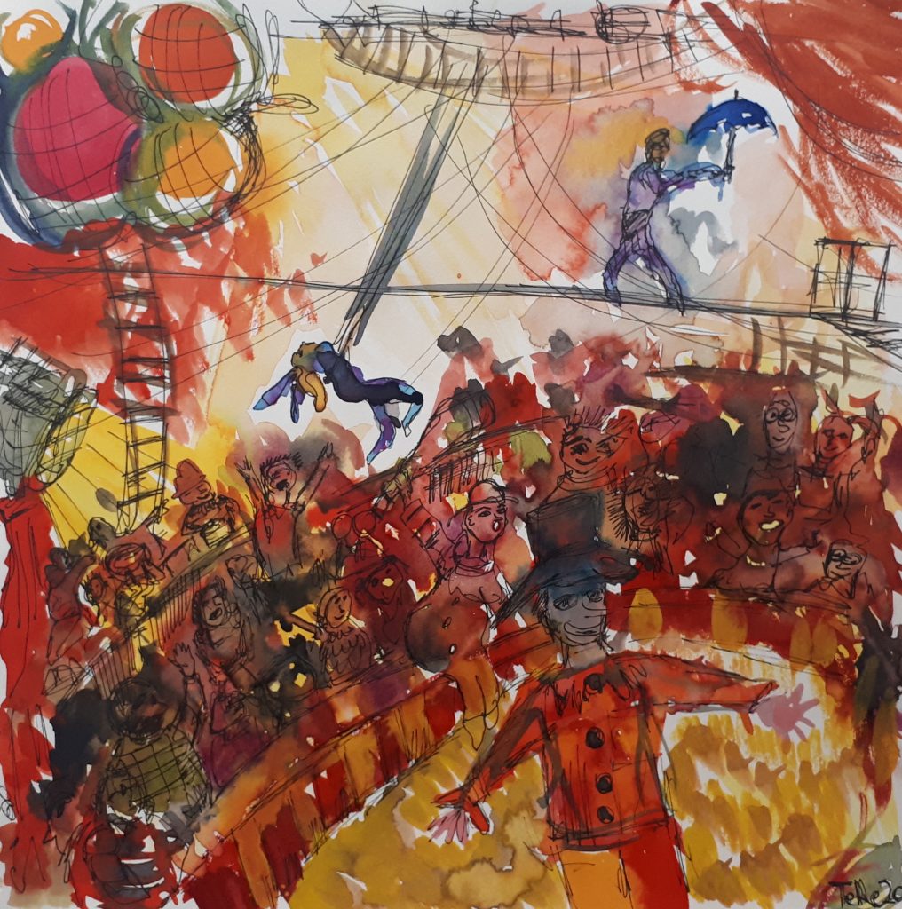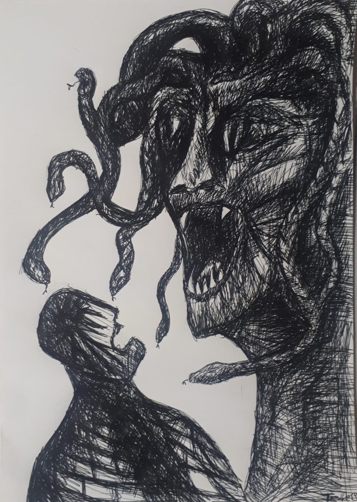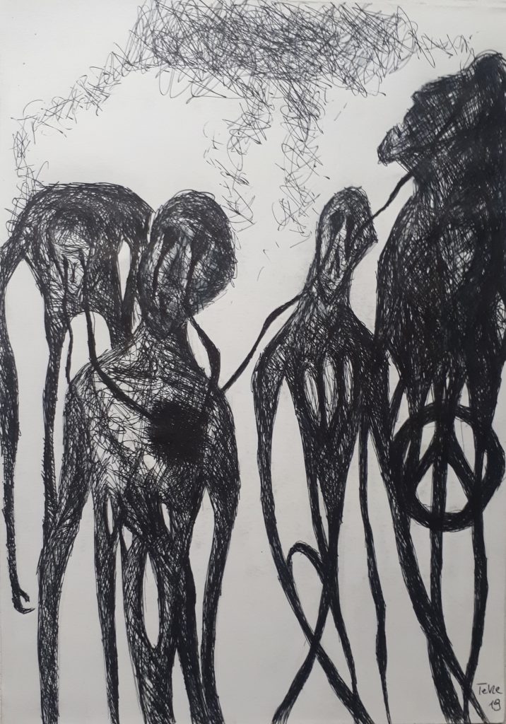 Here is a selection of my art work. I started drawing during the 2019 general election campaign. After a long day in the campaign office, I was mentally and physically exhausted. Reading was out of the question. So, I picked a movie to watch before bedtime and started doodling with a black ballpoint pen. I had not drawn since high school and had forgotten all about technique, perspective, and shading. I drew dinosaurs and demons for months. Eventually, friends started to get a bit concerned and kept giving me colored pencils. I resisted at first. Everything I did in color looked to me as if a kindergartener had drawn it. Nowadays, I work with anything available. Pencils, oil pencils, acrylics, oil, ink, but also household color on felt tiles, rocks, glass splinters, thread and needle, jute, wrapping paper, tin foil, denim, etc.